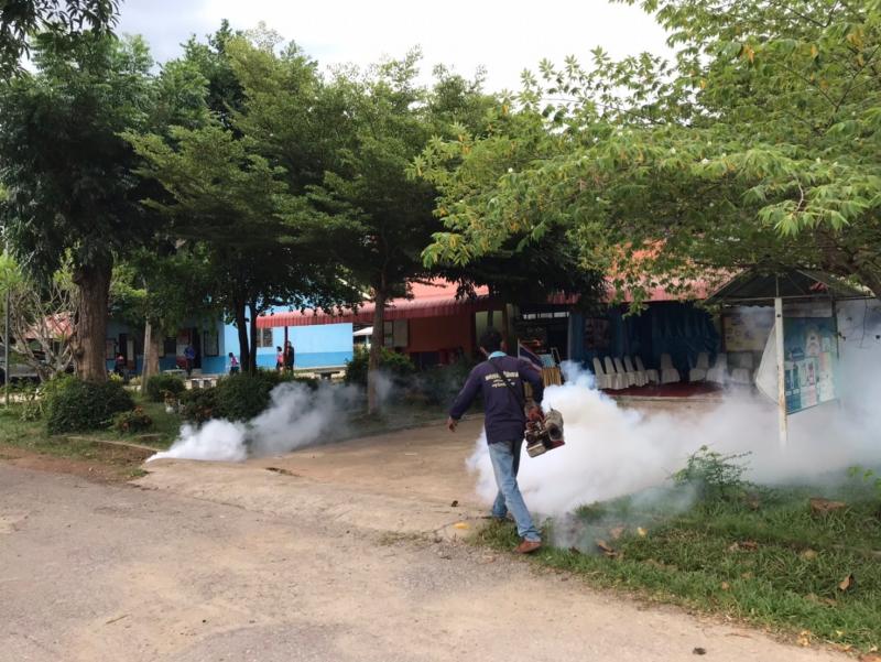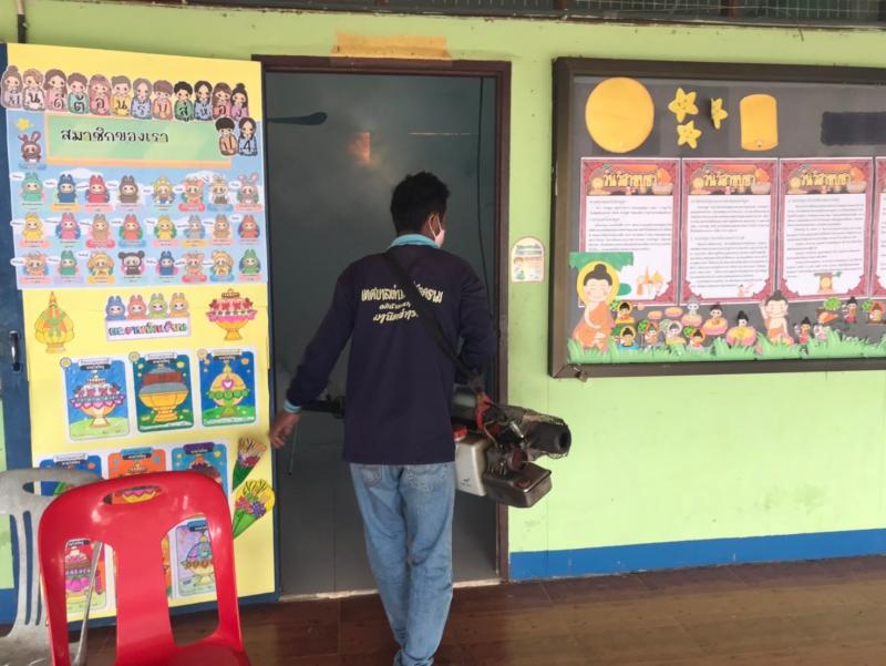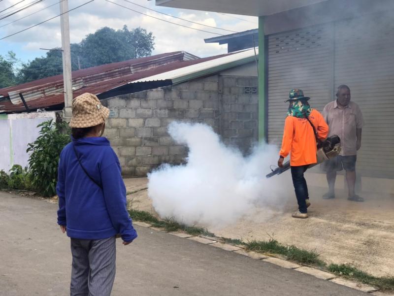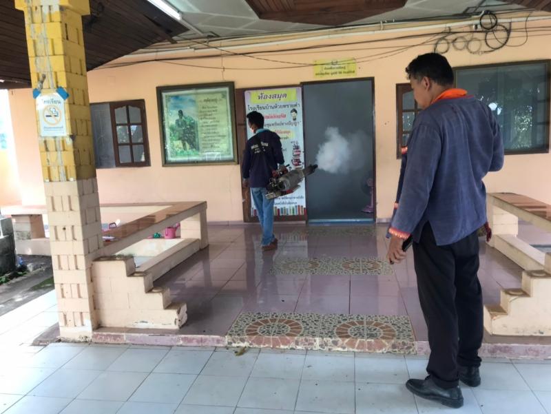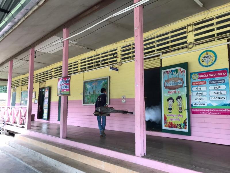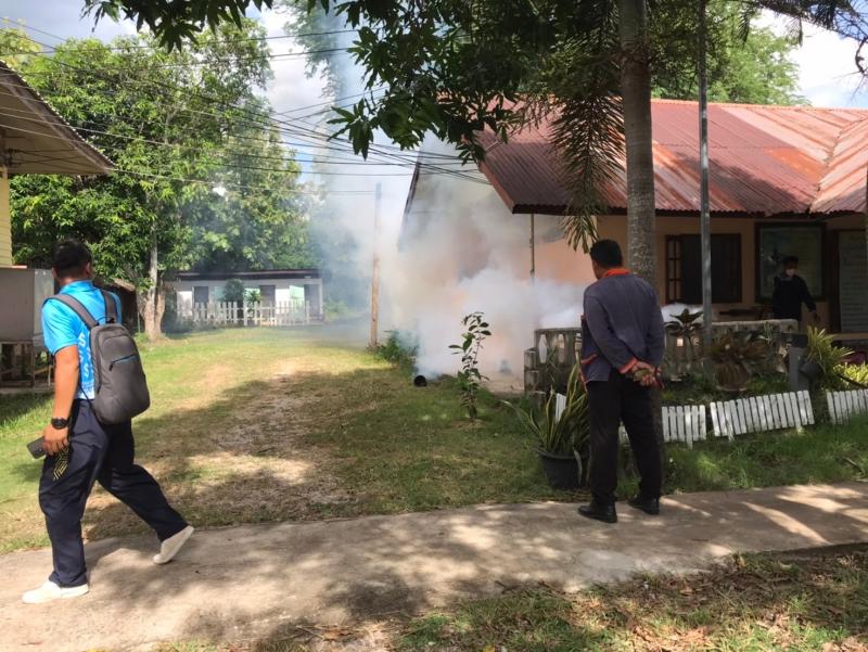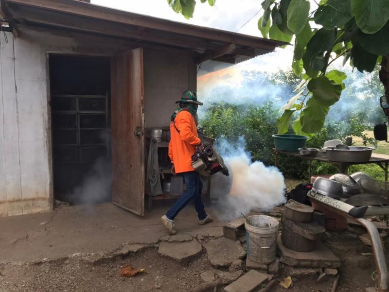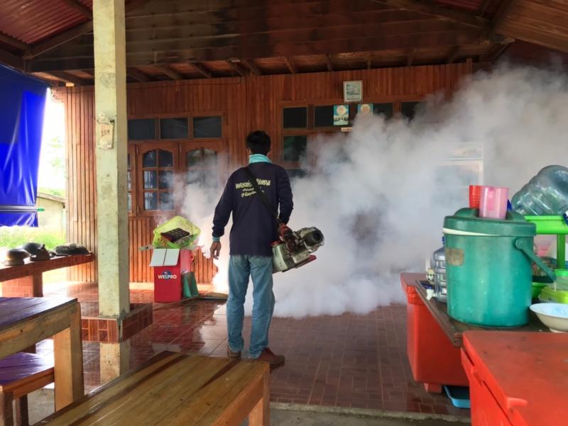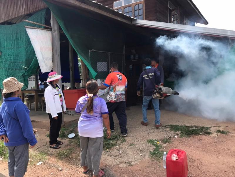 งานสาธารณสุขและสิ่งแวดล้อม ฉีดพ่นหมอกควันควบคุมและป้องกันโรคไข้เลือดออก รัศมีรอบๆ 100 เมตร จากบ้านผู้ป่วย ณ บ้านห้วยทรายคำ