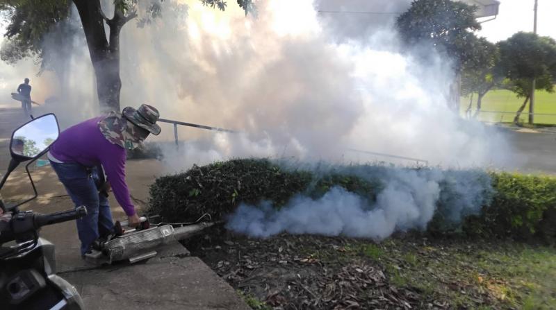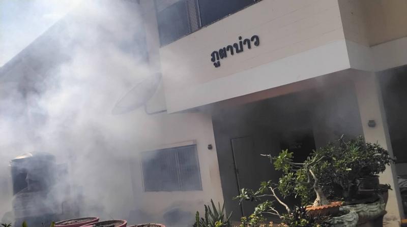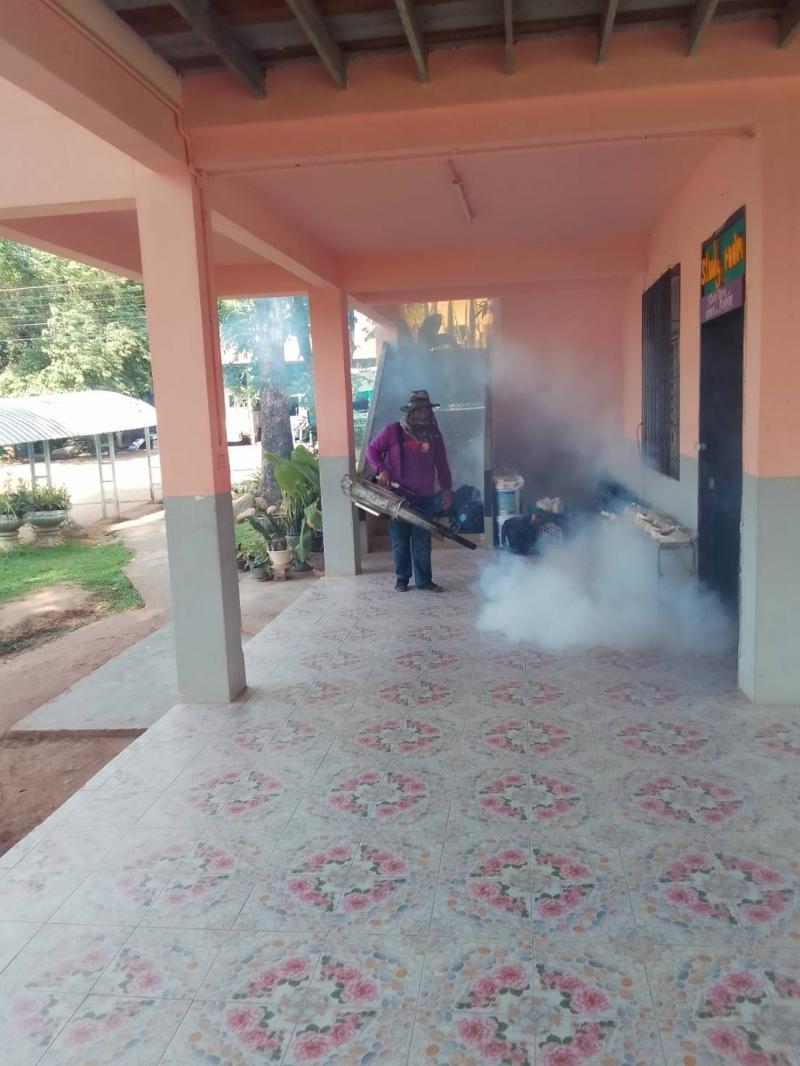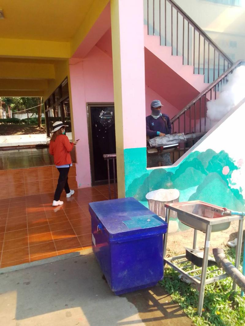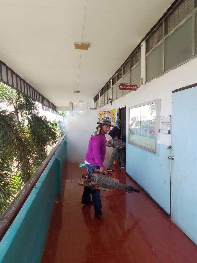 งานสาธารณสุขและสิ่งแวดล้อม ฉีดพ่นหมอกควันควบคุมและป้องกันโรคไข้เลือดออก รัศมีรอบๆ 100 เมตร จากห้องเรียนผู้ป่วย ณ โรงเรียนราชประชานุเคราะห์ 52 เลย