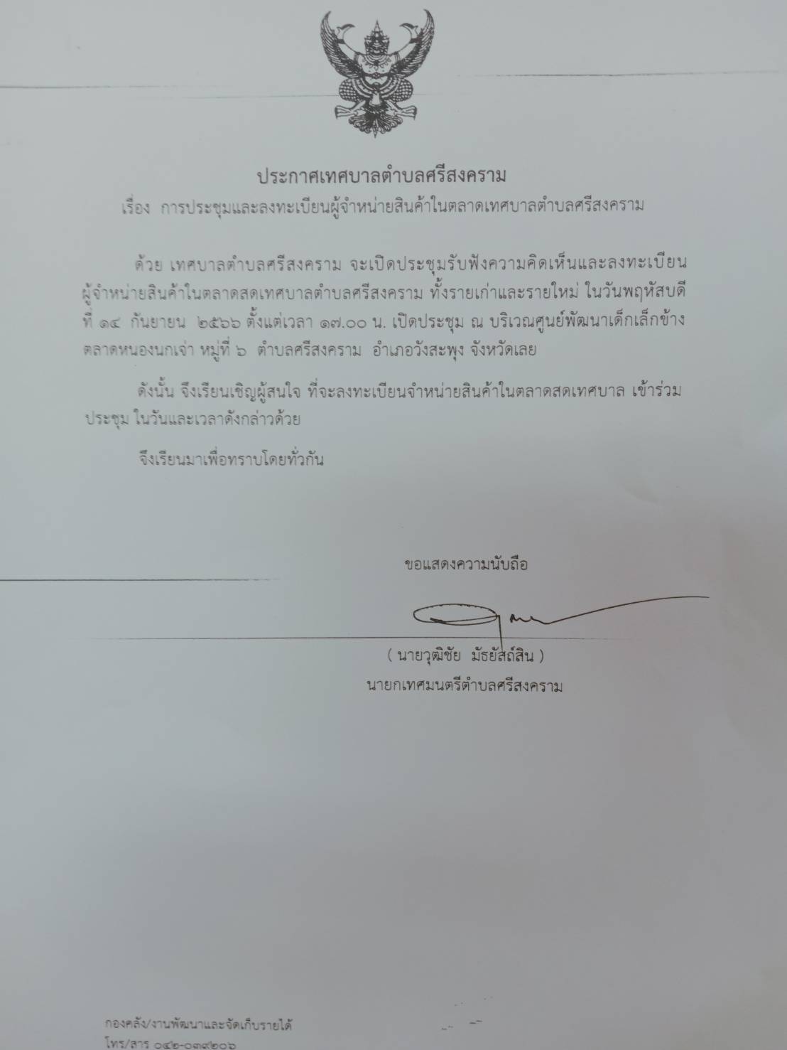 ประกาศเทศบาลตำบลศรีสงคราม เรื่องประชุมและลงทะเบียนผู้จำหน่ายสินค้าในตลาดเทศบาลตำบลศรีสงคราม