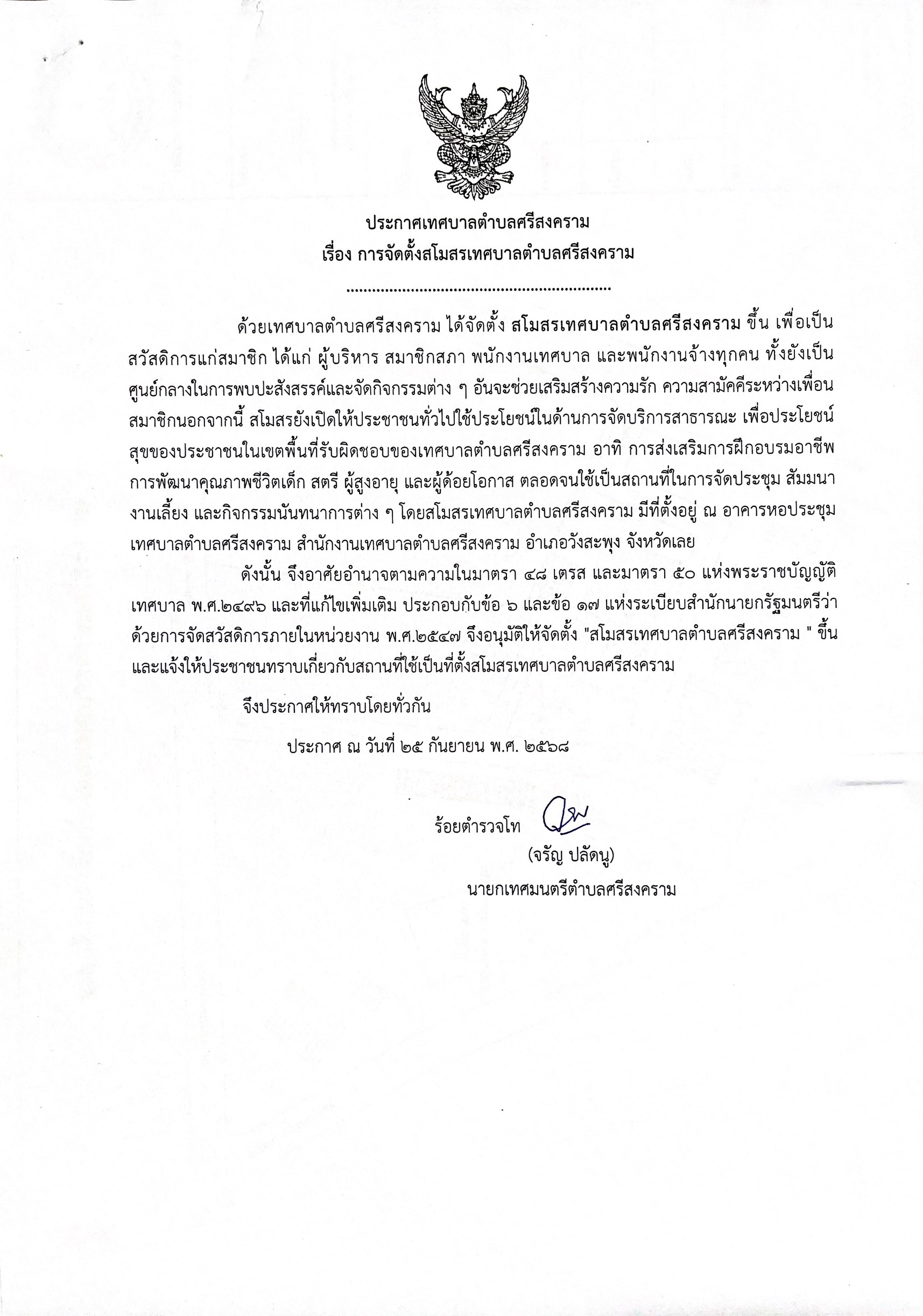 ชื่อเรื่อง : ประกาศเทศบาลตำบลศรีสงคราม เรื่อง การจัดตั้งสโมสรเทศบาลตำบลศรีสงคราม