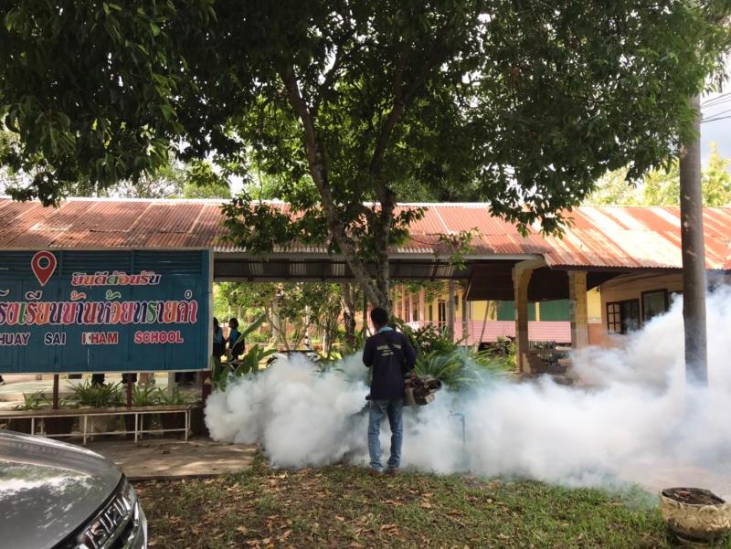 งานสาธารณสุขและสิ่งแวดล้อม ฉีดพ่นหมอกควันควบคุมและป้องกันโรคไข้เลือดออก รัศมีรอบๆ 100 เมตร จากบ้านผู้ป่วย ณ บ้านห้วยทรายคำ