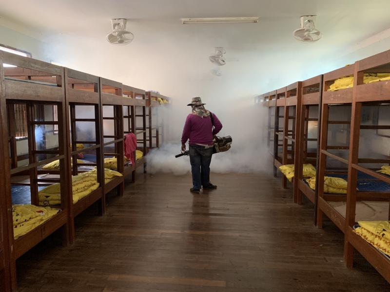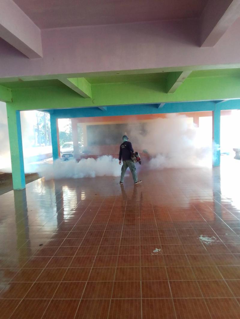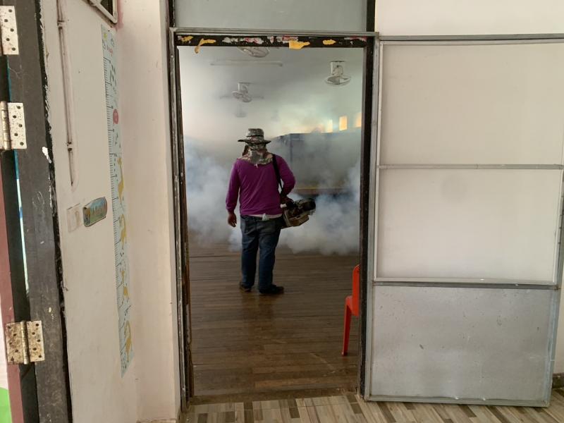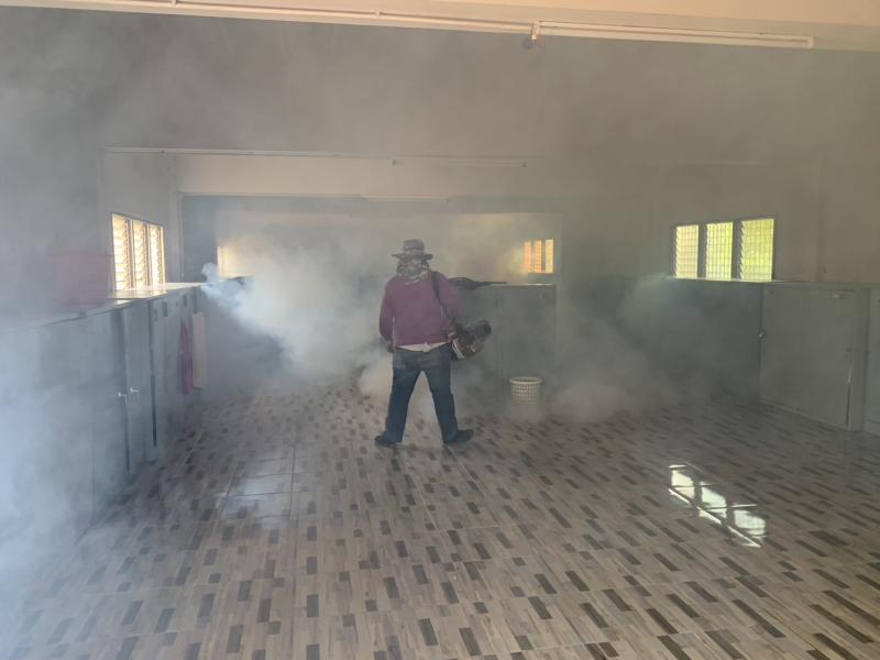 งานสาธารณสุขและสิ่งแวดล้อม ฉีดพ่นหมอกควันควบคุมและป้องกันโรคไข้เลือดออก รัศมีรอบๆ 100 เมตร จากห้องเรียนผู้ป่วย ณ โรงเรียนราชประชานุเคราะห์ 52 เลย