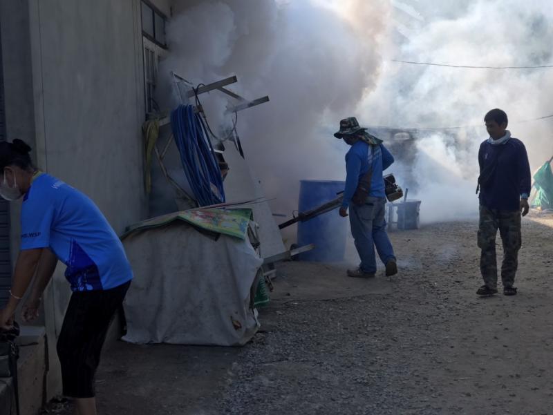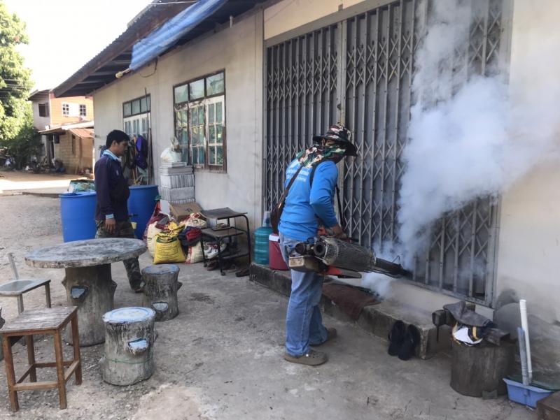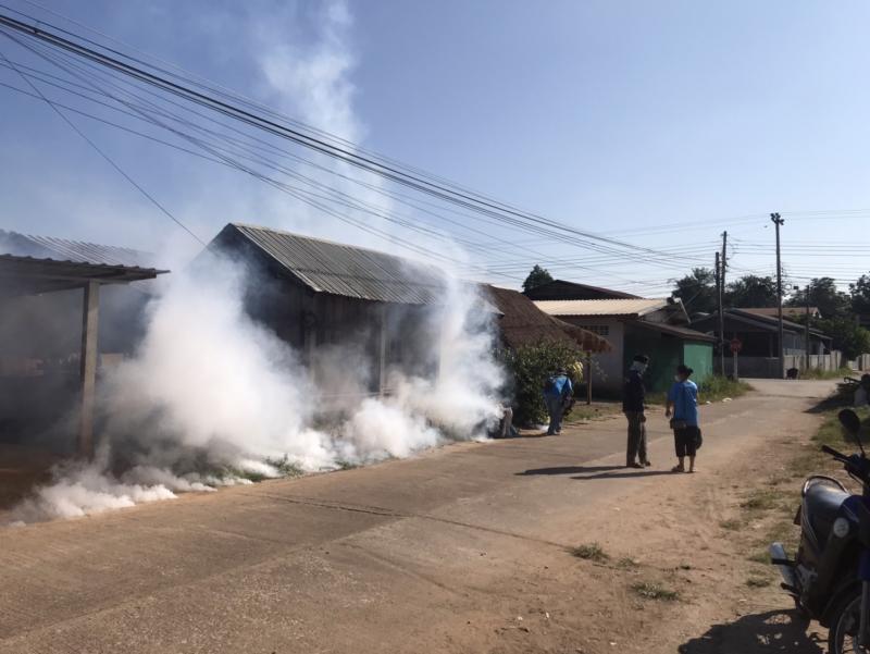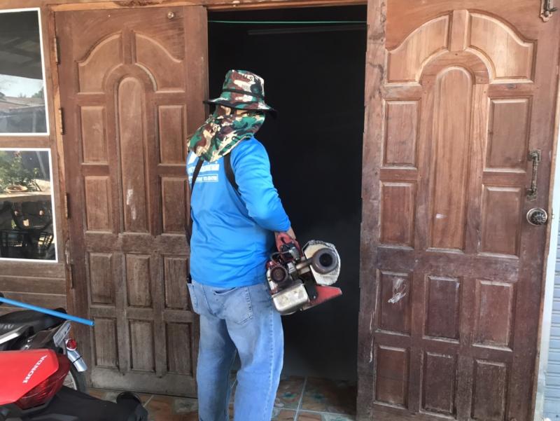 งานสาธารณสุขและสิ่งแวดล้อม ฉีดพ่นหมอกควันควบคุมและป้องกันโรคไข้เลือดออก รัศมีรอบๆ 100 เมตร จากบ้านผู้ป่วย ณ บ้านห้วยทรายคำ หมู่ที่ 7