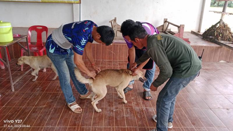 งานสาธารณสุขและสิ่งแวดล้อม ลงพื้นที่ฉีดวัคซีนป้องกันโรคพิษสุนัขบ้าในสุนัขและแมว ณ บ้านห้วยทรายคำ หมู่ที่ 7 และบ้านศรีสงคราม หมู่ที่ 11 ตำบลศรีสงคราม อำเภอวังสะพุง จังหวัดเลย